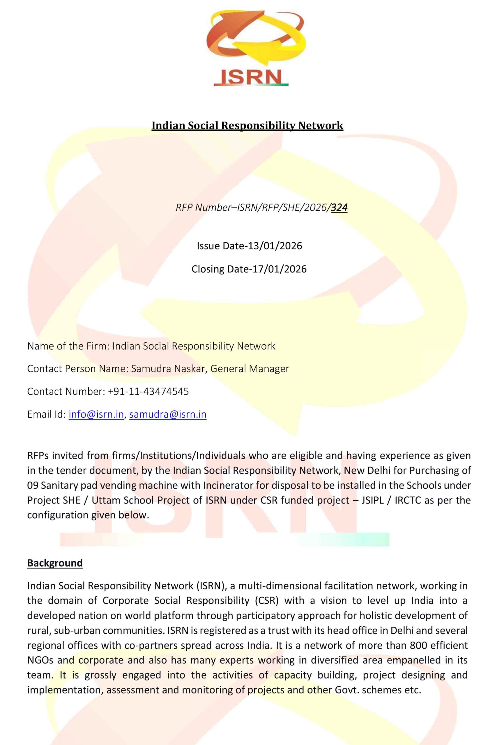 RFP Number–ISRN/RFP/SHE/2026/324